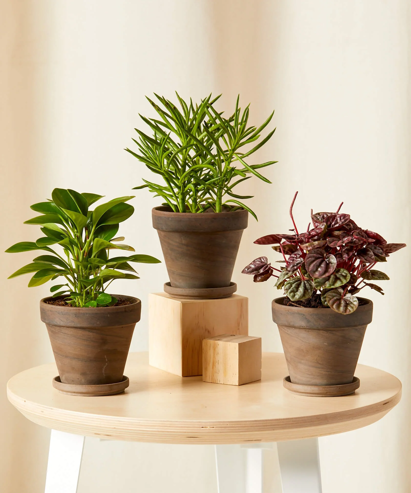 All three Peperomia in this collection are native to South America. They have semi-succulent stems and leaves, making them resilient plants that won’t be affected by a missed watering every once in a while.